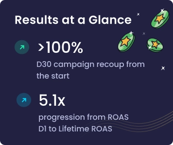 With the In-App Advertising (IAA) monetization strategy, the goal of the campaign was to acquire highly-engaged users who would generate IAA revenue. We were presented with a set of ROAS-related KPIs, and the campaign recoup was the primary goal.