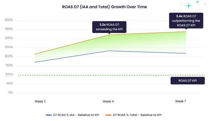 이러한 세그먼트들을 균형 있게 운영함으로써, 우리는 1주 차부터 ROAS D7 KPI를 크게 초과 달성할 수 있었습니다. 이를 통해 2개월 반 동안 캠페인을 9배로 안정적으로 확장하면서 KPI를 큰 폭으로 초과 달성할 수 있었습니다.